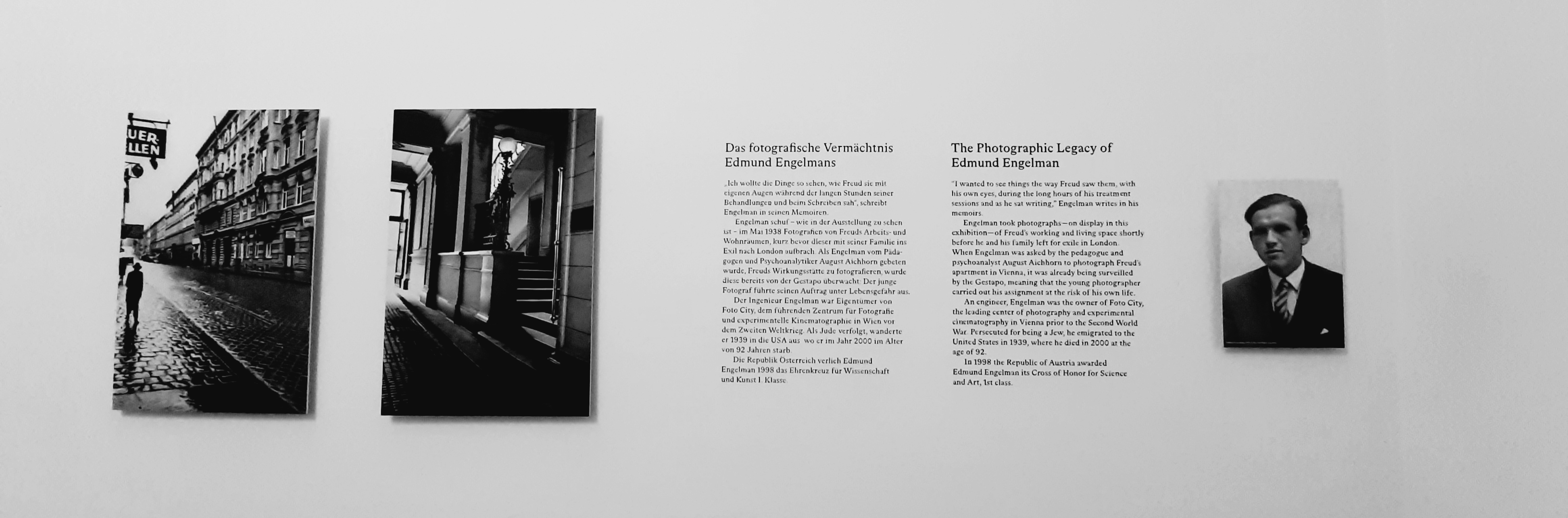 Die ursprüngliche Funktion der Räume wird an deren Wänden kommuniziert: Schlafzimmer, Bad, Ankleidezimmer etc. Einen Einblick in die Raumsituation damals vermitteln Fotos von Edmund Engelmann. Engelmann war ein junger Fotograf, der 1938, kurz bevor die Familie Freud ins Exil nach London ging, die Arbeit- und Wohnräume fotografierte. Freud persönlich kannte Engelmann nicht. Um die fotografische Dokumentation hatte ihn der Pädagoge und Psychoanalytiker August Aichhorn gebeten. Über Umwege sind die Fotos dann bei Anna Freud in London aufgetaucht.
