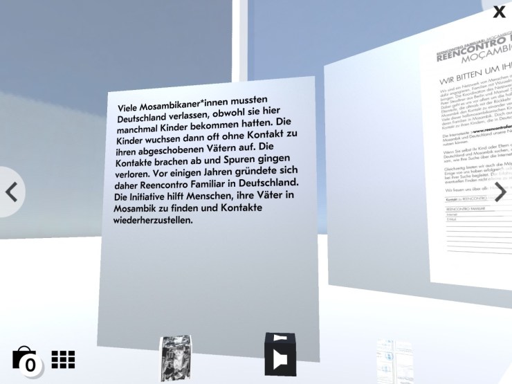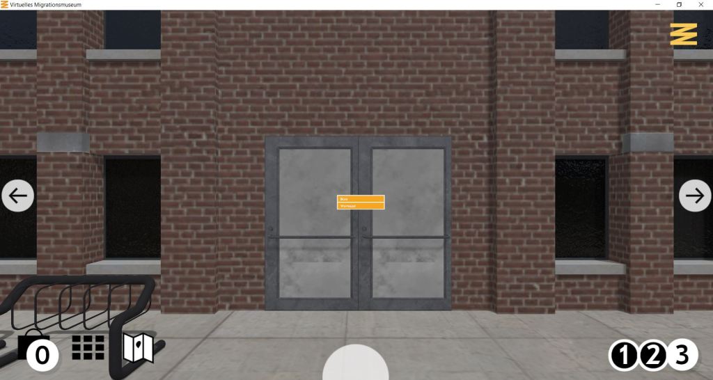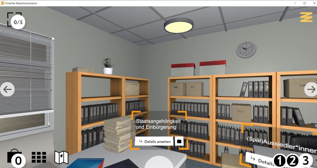 Das Virtuelle Migrationsmuseum vermittelt Migrationsgeschichte(n) Deutschlands. Es ist als App bzw. Download für digitale Devices verfügbar und lässt sich auch mit einer VR Brille erkunden. Die Nutzer*innen bewegen sich im virtuellen Raum durch eine Stadt mit verschiedenen Orten. In den einzelnen Gebäuden werden jeweils thematische Schwerpunkte aufgezeigt. Das geschieht in drei Zeitebenen.