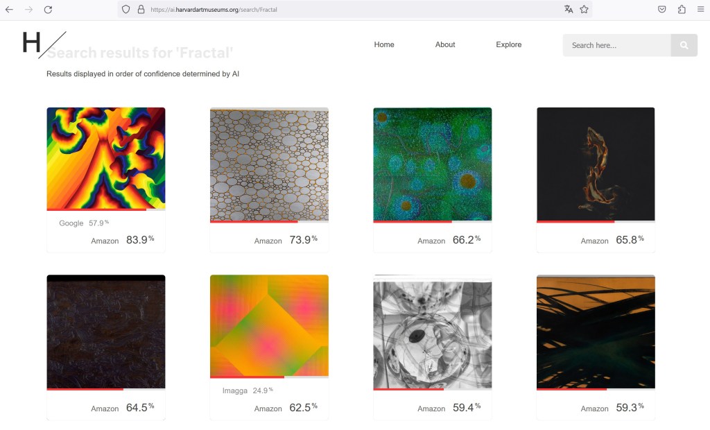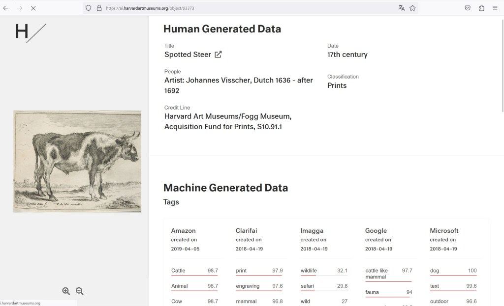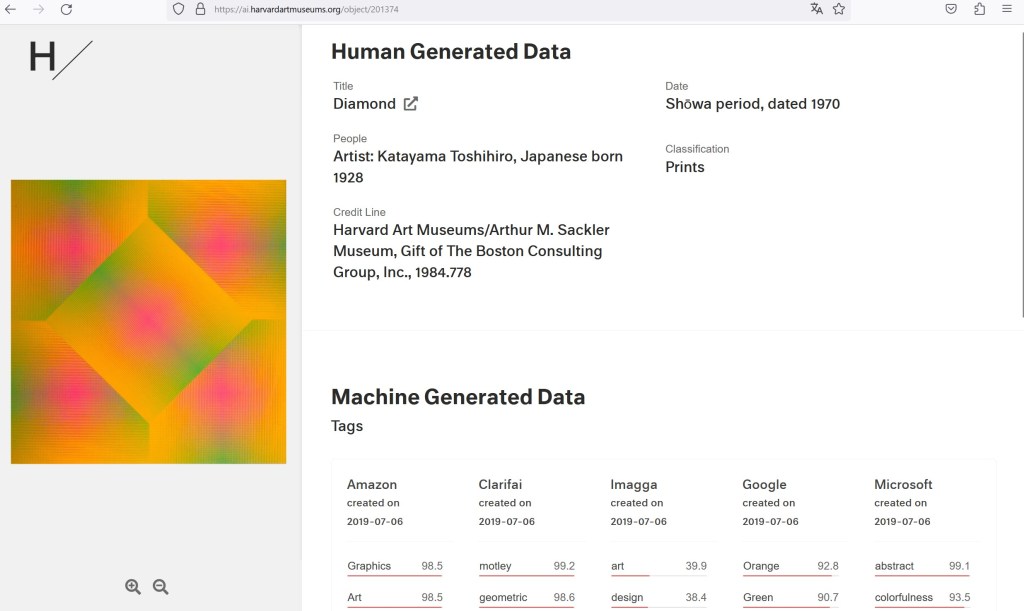 Starting in 2016 the Harvard Art Museums department of Digital Infrastructure and Emerging Technology (DIET) began using artificial intelligence to describe the museum’s collection. Using AI, they have collected 47,246,122 machine-generated descriptions and tags covering 317,484 images of artworks. Ranging from object recognition to face analysis that predicts gender, age, and emotion, the data reveals how computers interpret paintings, photographs, and sculptures.